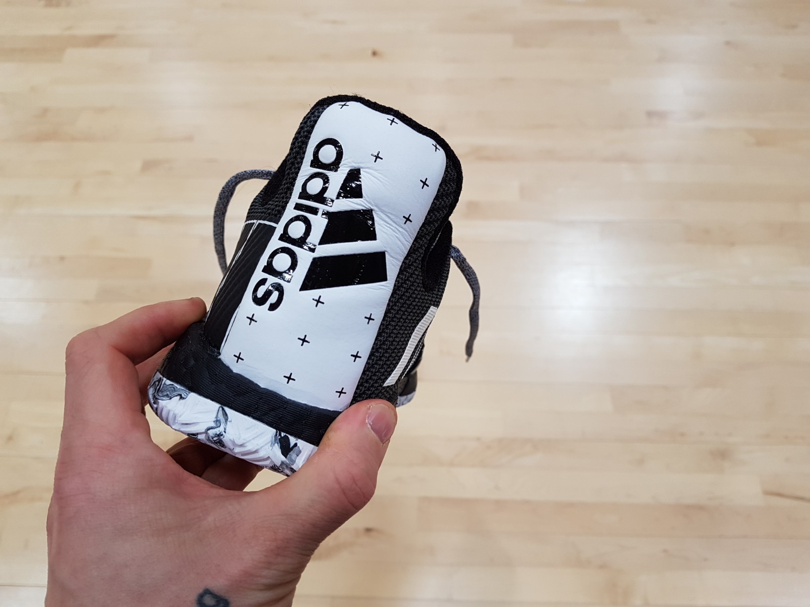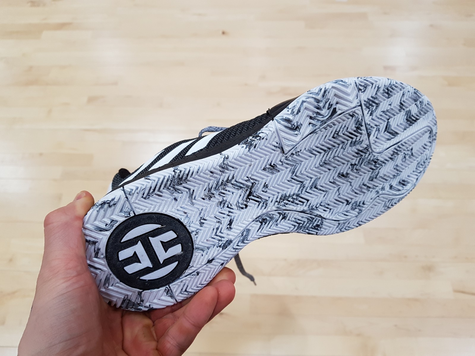 Pohjan kuvioinnissa Adidas luottaa tällä kertaa “aina toimivaan” herringbone-kuviointiin ja se harvemmin pettää. Kuviointi on pohjan takaosassa ja ulkolaidalla hieman väljempi, muiden osien ollessa tasaisen tiheää. Puhtaalla lattialla pito on mainio ja luotettava. Vähänkin likaisemmalla lattialla tiheä kuvio tuppaa keräämään pölyt mukaan pirun nopeasti ja pohjaa joutuukin pyyhkäisemän melko usein. Onneksi pyyhkiessä pölyt lähtevät helposti ja pohja pitää jonkin aikaa taas hienosti. Väljempi ja syvempi kuviointi olisi varmaan ollut parempi ratkaisu joten annetaan pisteitä nyt vaikka 3.5/5.